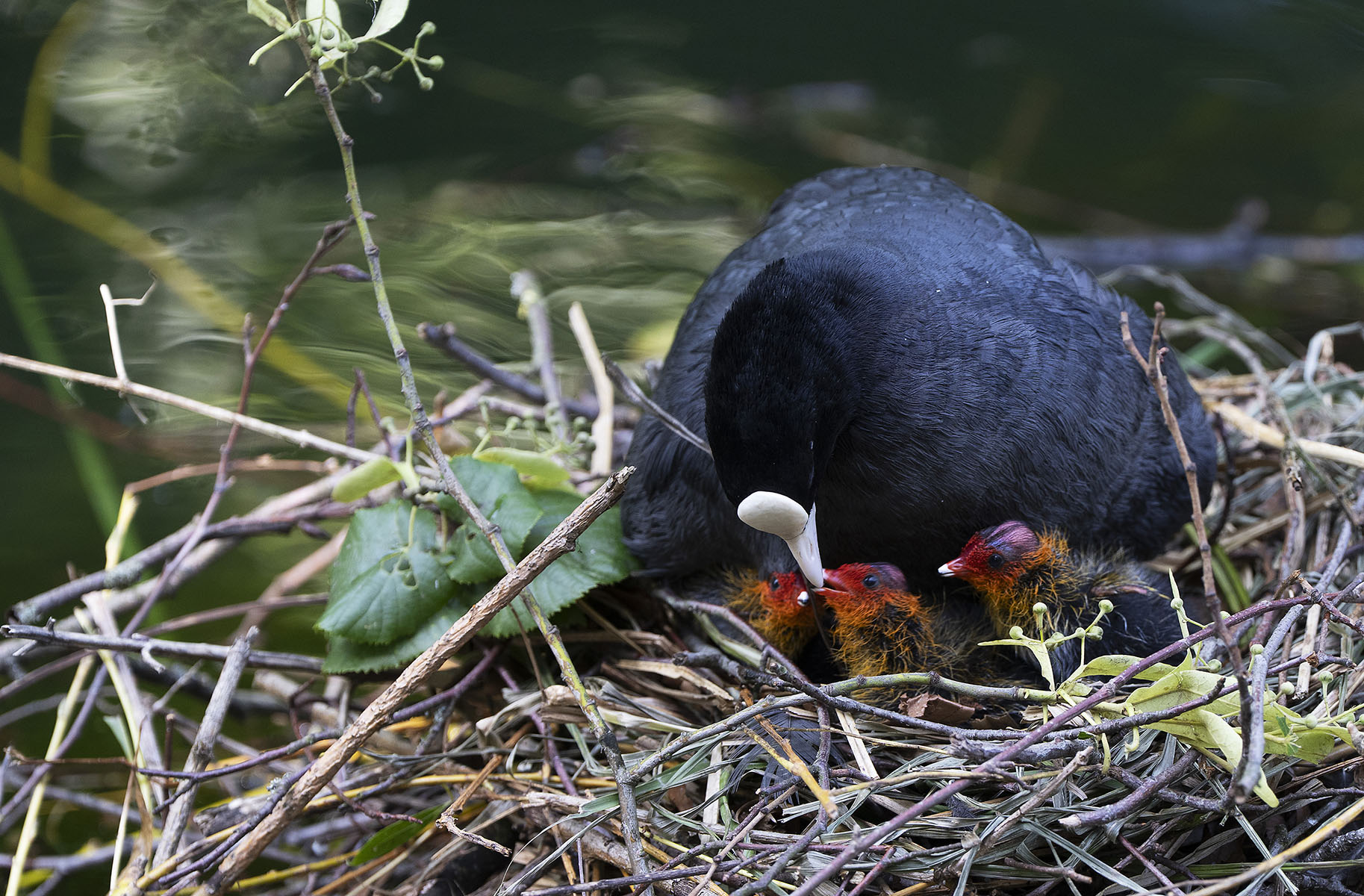 Blässhuhn (Fulica atra) mit Küken im Moerser Schlosspark
