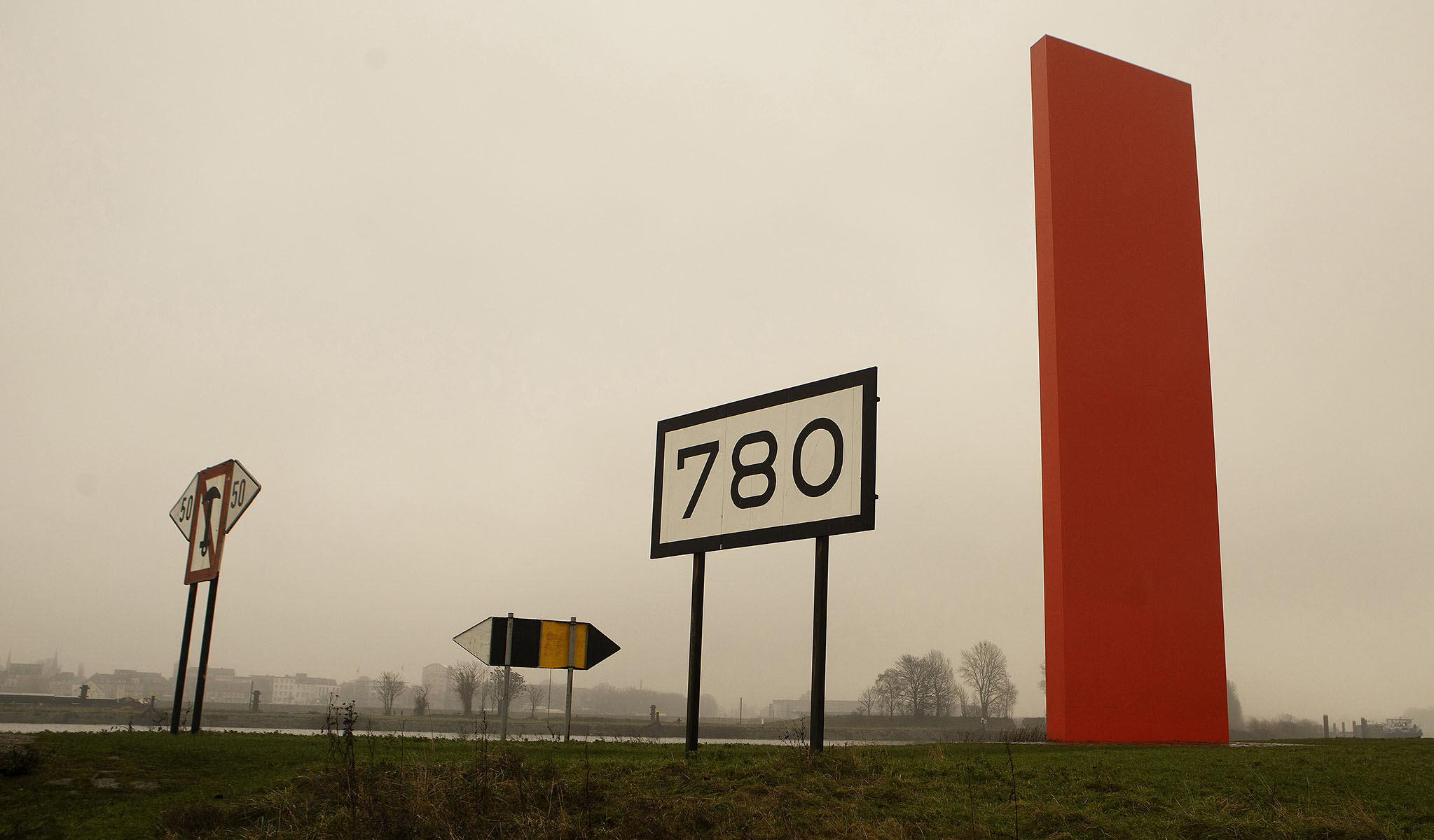 Skulptur Rheinorange im Nebel