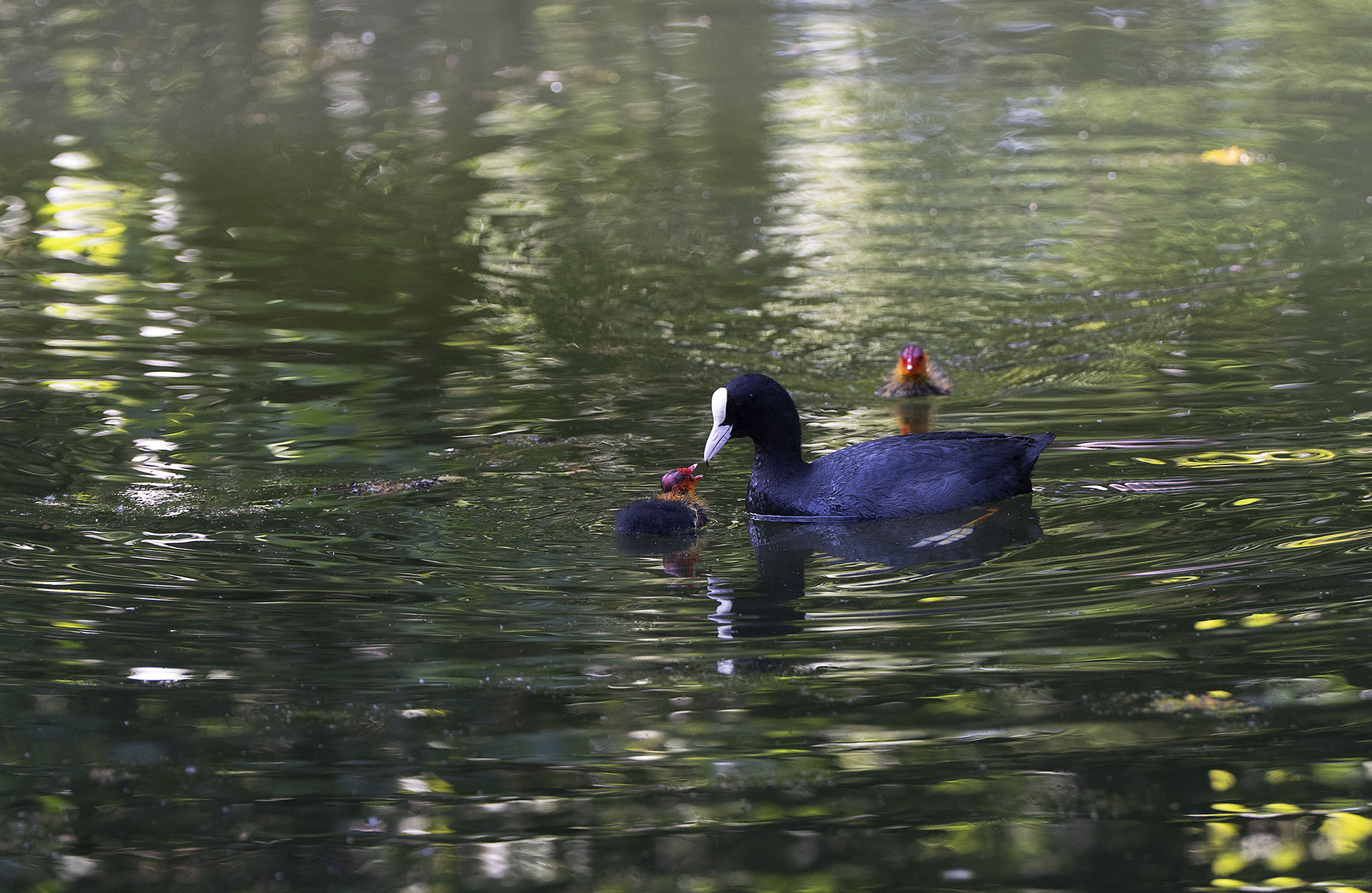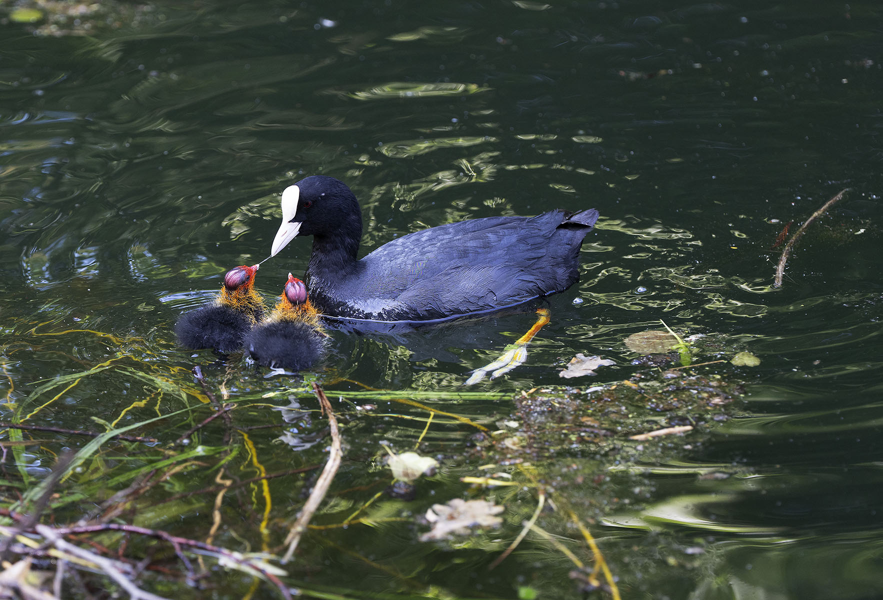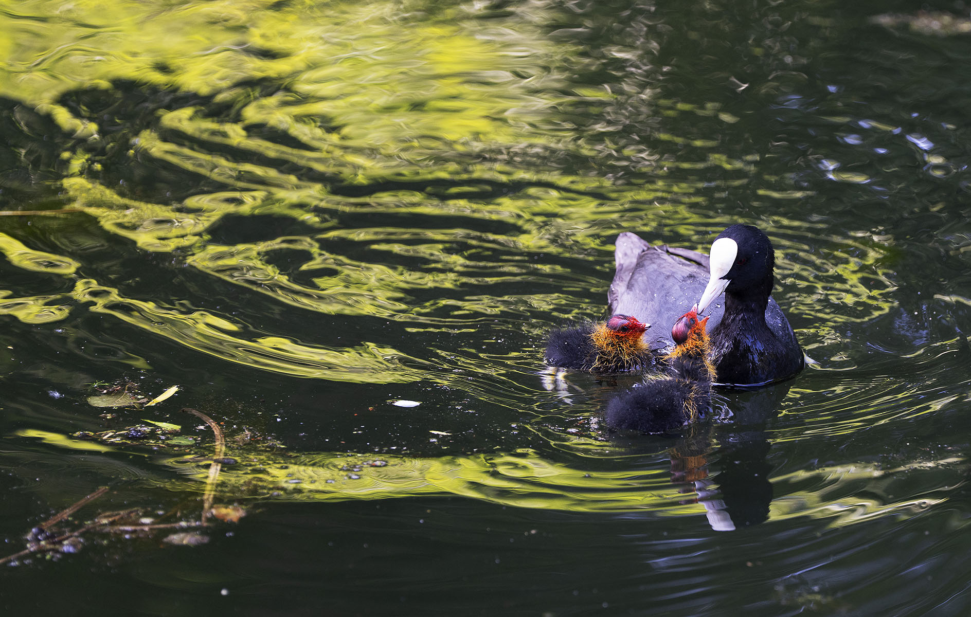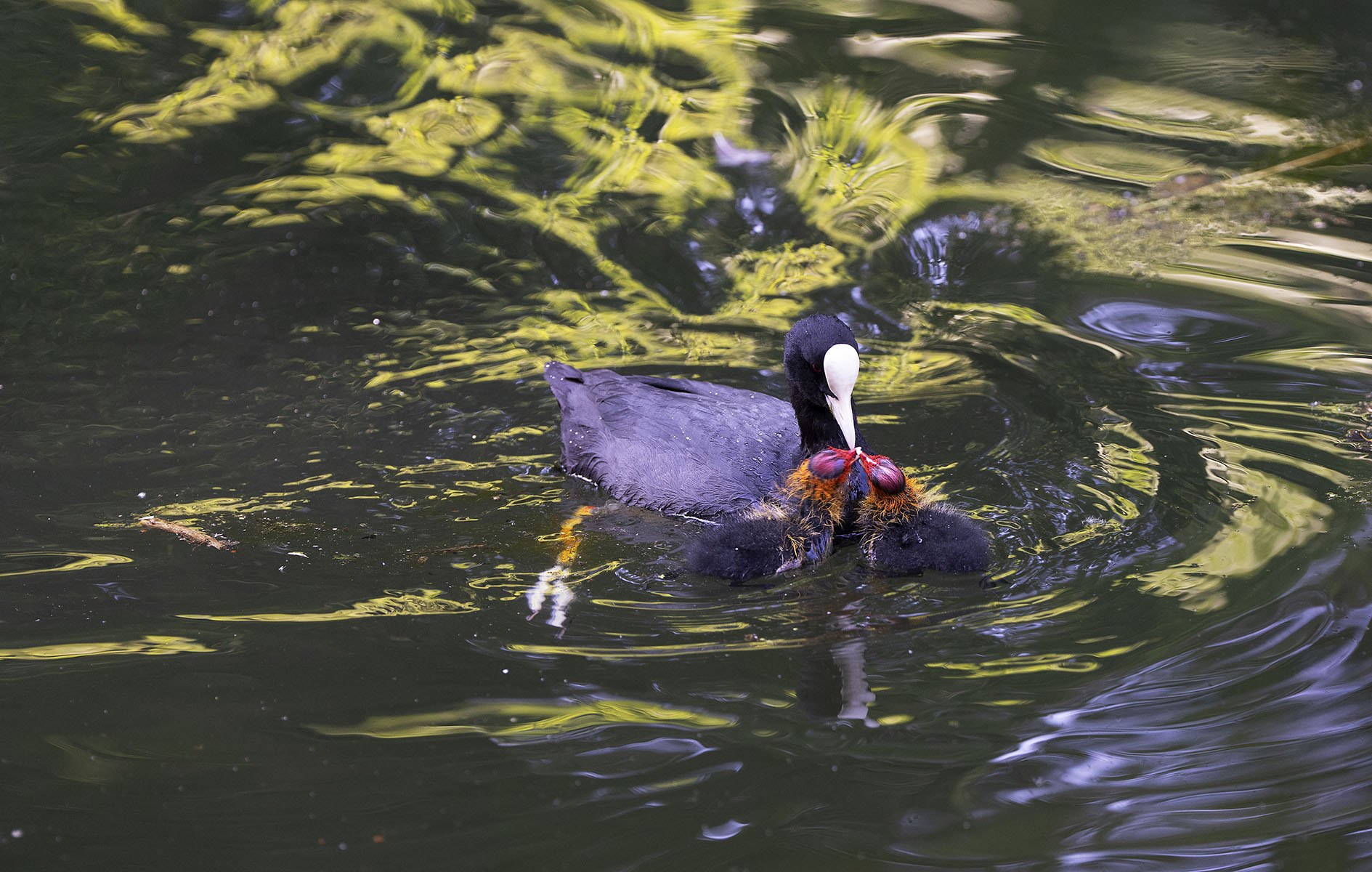 11. Juni 2025    Blässhuhn (Fulica atra) mit Küken im Moerser Schlosspark